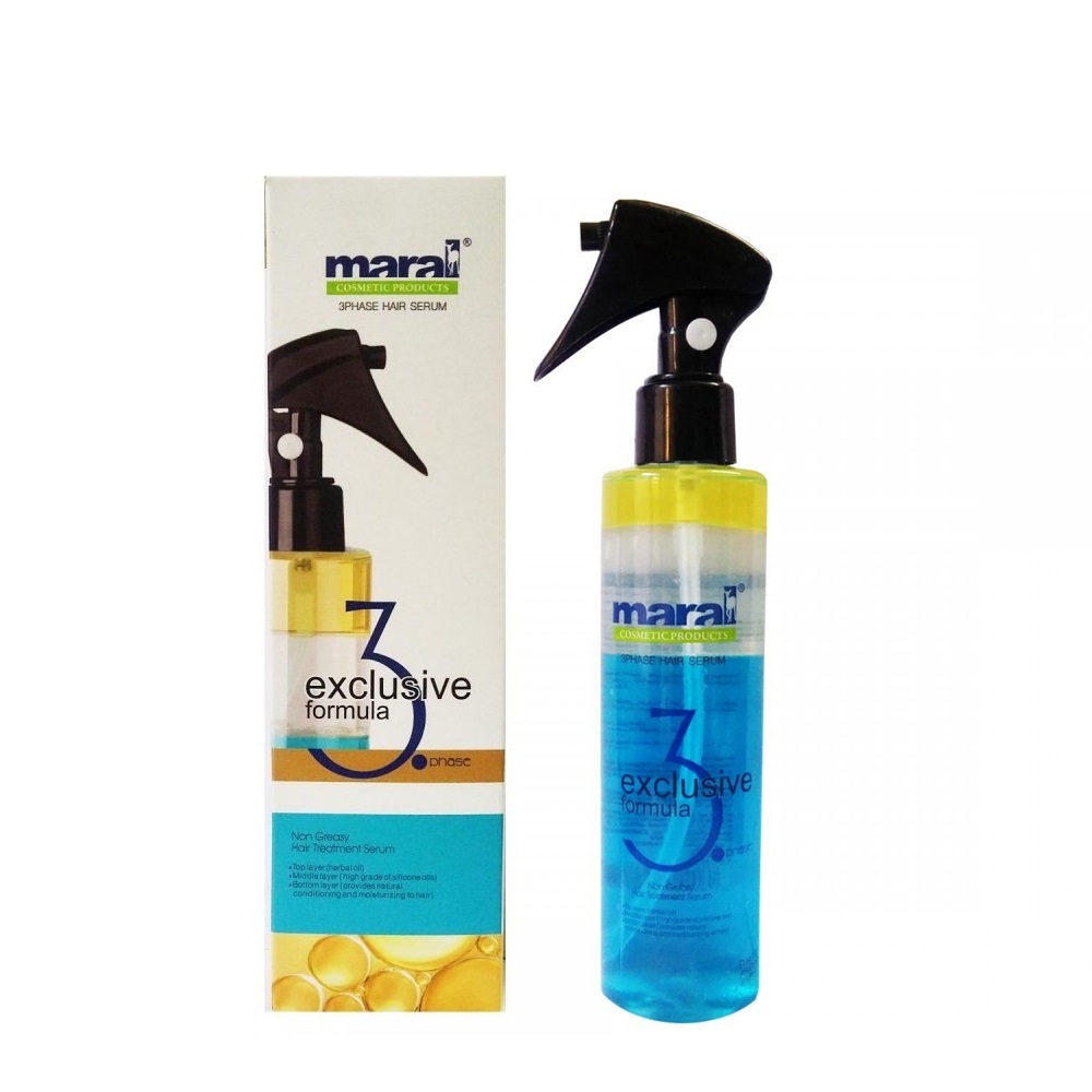 سرم مو اسپری سه فاز مارال مدل Exclusive 3 Formula, دارای 3 فاز جداگانه است که فاز اول آن غنی شده با روغن های گیاهی برای تقویت و ترمیم مو، فاز دوم حاوی سیلیکون جهت محافظت از مو و درخشان کننده ی مو ها و فاز سوم آن حاوی گلیسیرین، نرم کننده و آبرسان ساقه ی مو می باشد. روغن های بی نظیری مانند آرگان، آووکادو، زیتون و جوجوبا باعث کاهش آسیب حرارت اتو و سشوار به ساقه مو می شود. از دیگر تاثیرات فوق العاده سرم سه فاز مارال می توان به از بین رفتن وز، الکتریسیته ساکن و موخوره اشاره کرد.