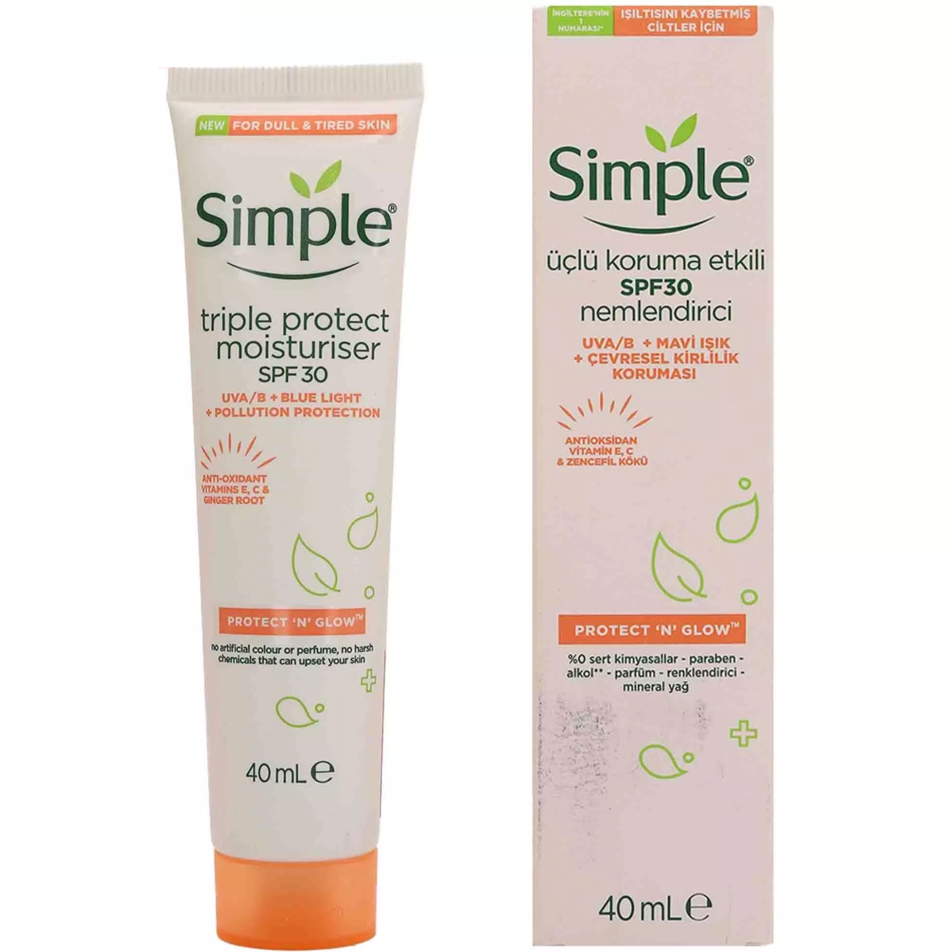 ضد آفتاب Simple، بالا ترین سطح فاکتور های مراقبتی پوست (UVA و UVB ) در برابر نور خورشید را دارا است. همچنین در برابر اشعات ماوراء بنفش و اشعات مضر محیطی نیز با قدرت فراوان از پوست محافظت می کند. ترکیبات مهم و تاثیر گذار این ضد آفتاب، شامل ریشه زنجبیل، ویتامین E و ویتامین C می باشد. ضمن اینکه در روشن شدن تناژ پوست و همچنین جلوگیری از بروز لک، نقش پر رنگی ایفا کرده و به طور کامل پوست را تغذیه می کند. بافت این ضد آفتاب، بسیار سبک و زود جذب می باشد. به علاوه، این ضد آفتاب فاقد الکل، پارابن، رنگ، چربی، عطر و هرگونه مواد شیمیایی مضر است.